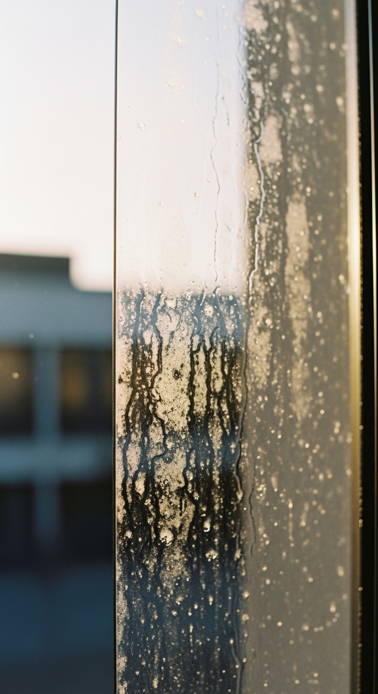 Those minerals — mostly calcium and magnesium — deposit on glass every time water touches it. Sprinklers, rain, pool splash, even washing your car. In 115-degree heat, those deposits bake on like ceramic glaze.